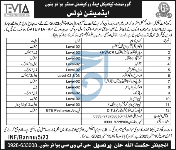 Technical Education & Vocational Training Authority KPTEVTA Short Courses admissions 2023 has been announced. Technical Education & Vocational Training Authority KPTEVTA Bannu Khyber Pakhtunkhwa KPK Pakistan welcomes students to apply for admissions in academic year 2023 in Technical College. Students for admissions in Course can apply for online or campus classes as per Government institute criteria till admission closing date September 10, 2023. Read newspaper ad for exact details.