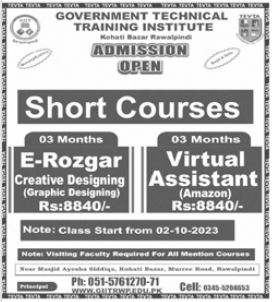 Admissions in Government Technical Training Institute 2023 for E Rozgar Creative Designing, Virtual Assistant has been announced. Students can enroll for admissions in Government Technical Training Institute Rawalpindi Punjab Pakistan for academic year 2023 to continue campus based or online education in Management Course. Eligible candidates for admissions in Course can apply as per Government institute criteria and before closing date 25 September 2023 after reading advertisement online. Read newspaper ad for exact details.