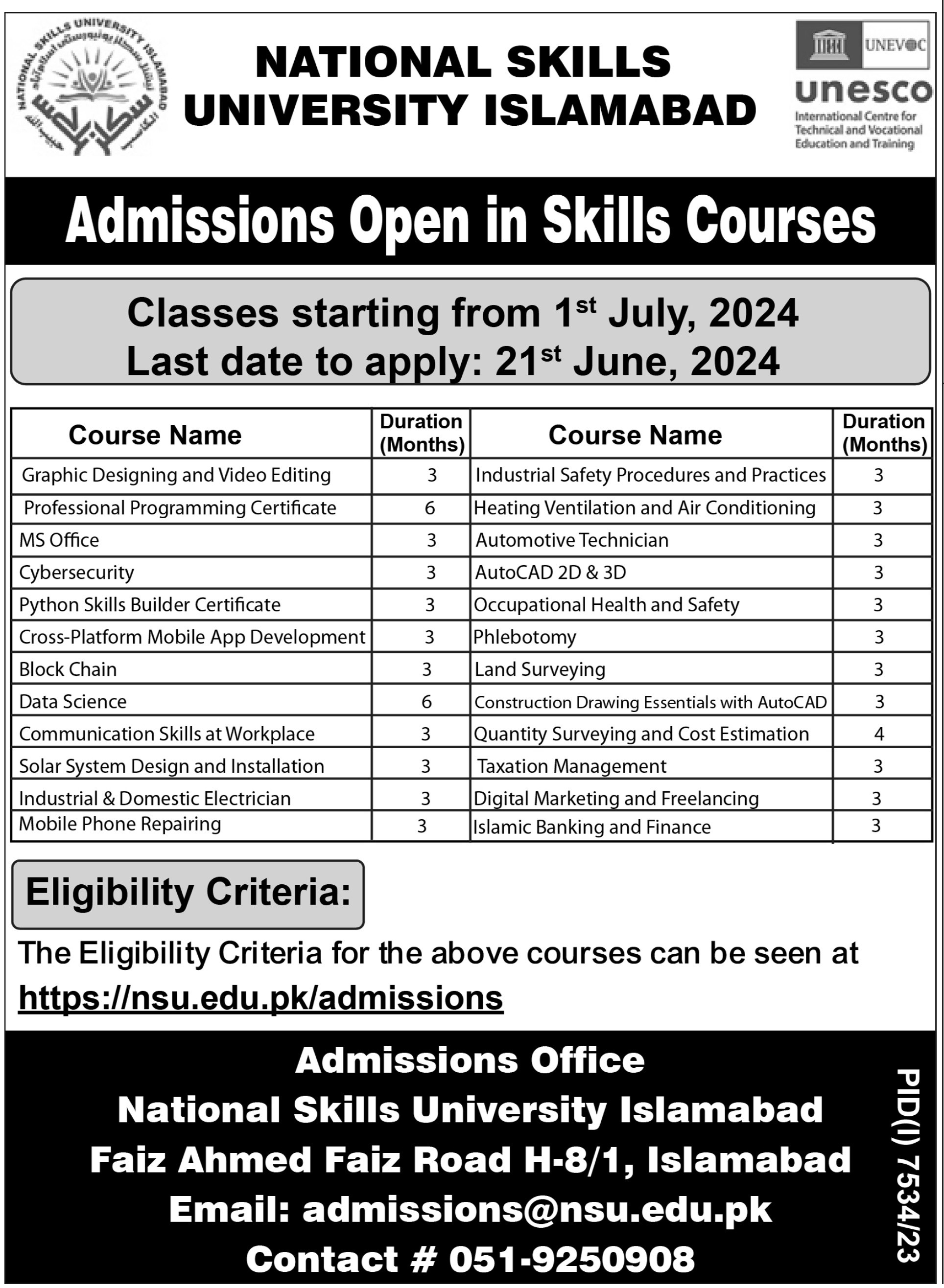 Admissions in National Skills University 2024 for Short Courses has been announced. Eligible students who qualify as per admission criteria in National Skills University Islamabad Islamabad Pakistan can apply in Management University for academic year 2024. Students who want to enroll for academic session 2024 in Course qualification and admission criteria for Government institute can apply till last date 21 June 2024. Read newspaper ad for exact details.
