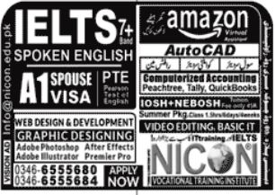 Admissions in Nicon Vocational Training Institute 2023 for IELTS Spoken English, Web Design and Development, Graphic Designing, Adobe Photoshop, Adobe Illustrator, Autocad, Civil Surveyor, Quantity Surveyor, Draftsman, Peachtree, Tally, Quickbooks, IOSH, NEBOSH has been announced. Eligible students can apply for academic admissions 2023 in Nicon Vocational Training Institute Rawalpindi Punjab Pakistan for Management Course. Eligible candidates for admissions in Course can apply as per Private institute criteria and before closing date 9 May 2023 after reading advertisement online. Read newspaper ad for exact details.