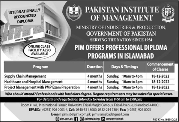 Pakistan Institute of Management Supply Chain Management, Healthcare and Hospital Management, Project Management with PMP Exam Preparation admissions 2022 has been announced. Students can enroll for admissions in Pakistan Institute of Management Islamabad Islamabad Pakistan for academic year 2022 to continue campus based or online education in Management College. Students for admissions in Course & criteria can apply as per Government institute admission policy 2022 before closing date December 15, 2022 as per advertisement. Read newspaper ad for exact details.