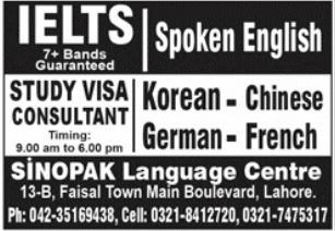 SINOpak Language Centre has announced admissions 2023 for IELTS Spoken English, Korean Language, Chinese Language, German Language, French Language. Eligible students can apply for academic admissions 2023 in SINOpak Language Centre Lahore Punjab Pakistan for Language College. Students for admissions in Course & criteria can apply as per Private institute admission policy 2023 before closing date February 28, 2023 as per advertisement. Read newspaper ad for exact details.