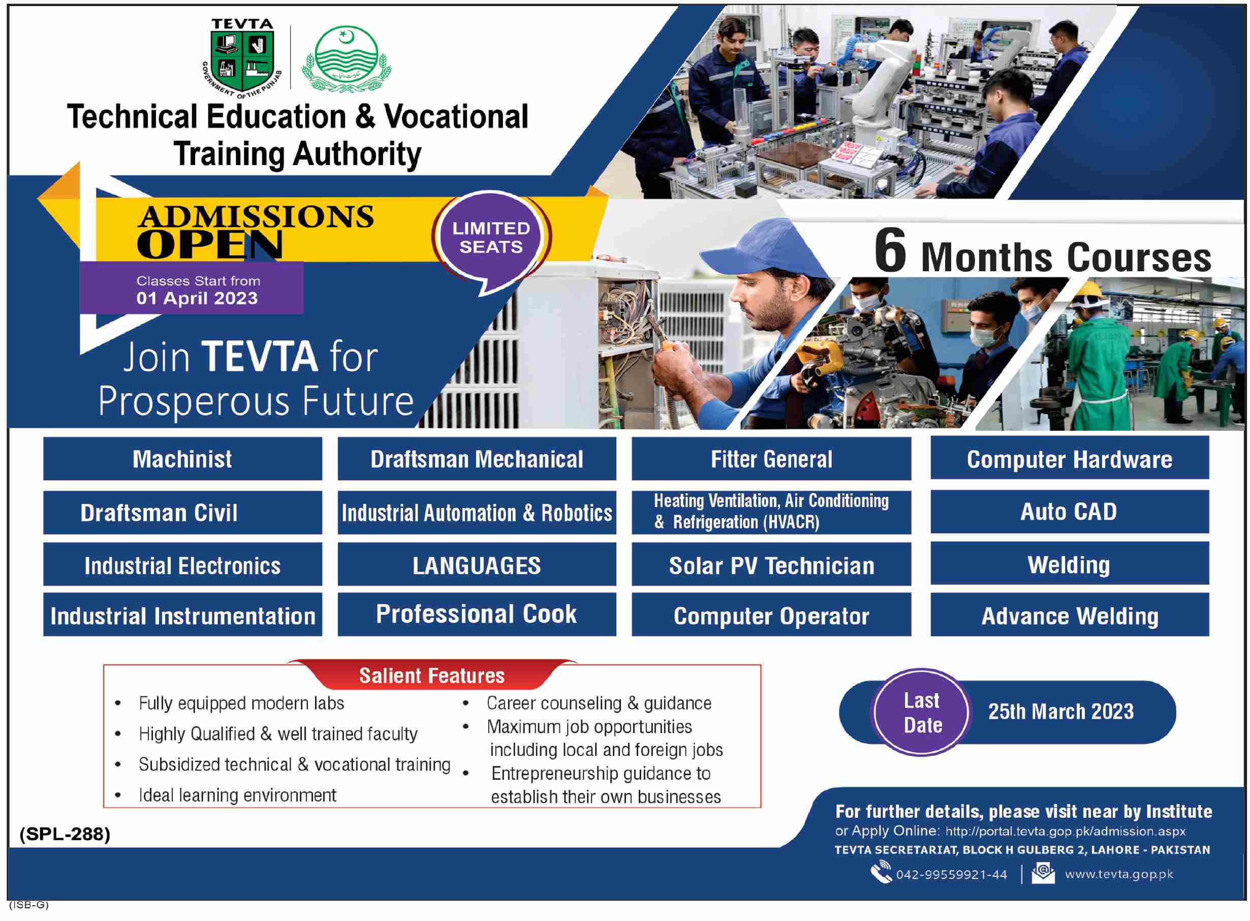 Technical Education & Vocational Training Authority TEVTA admissions 2023 for Machinist, Draftsman Mechanical, Filter General, Computer Hardware, Draftsman Civil, Industrial Automation and Robotics, Heating Ventilation, Air Conditioning and Refrigeration, Autocad, Industrial Electronics, Languages, Solar PV Technician, Welding, Industrial Instrumentation, Professional Cook, Computer Operator, Advance Welding has been announced. Students who want to take admissions in Technical Education & Vocational Training Authority TEVTA Lahore Punjab Pakistan for academic year 2023 to continue education in Management College can apply. Students for admissions in Course can apply for online or campus classes as per Government institute criteria till admission closing date March 25, 2023. Read newspaper ad for exact details.