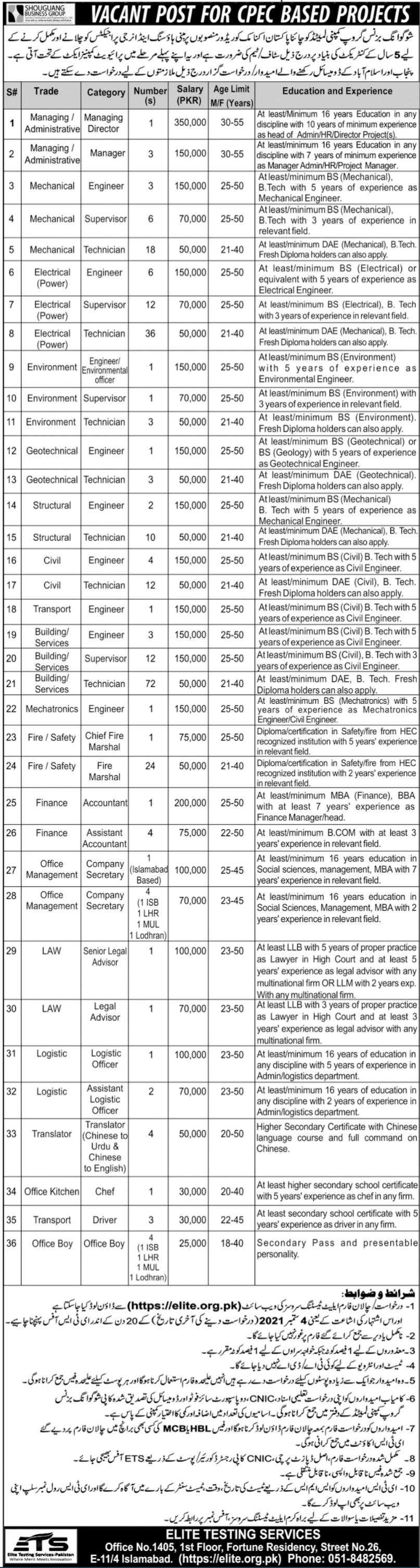 Shouguang Business Group Company Limited is looking for experienced and technical personnel for the posts of Managing Director, Administrative Manager, Mechanical Engineer, Mechanical Supervisor, Mechanical Technician, Electrical Power Engineer, Environment Engineer, Environmental Officer, Geotechnical Engineer, Structure Engineer, Civil Technician, Building Engineer, Services Supervisor, Mechatronics Engineer, Chief Fire Marshal, Fire Marshal, Accountant, Assistant Accountant, Company Secretary, Legal Advisor, Logistic Officer, Chef, LTV Driver, HTV Driver, Chinese to Urdu Translator, Chinese to English Translator and Office Boy in Islamabad through Elite Testing Services 2021.