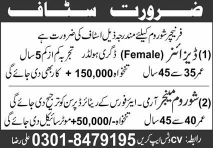 Showroom Manager & Female Designer Jobs 2022 in Lahore