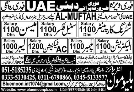 Vacant posts including mason, plumber, electrician, labor, shuttering carpenter, ac technician and steel fixer are announced in Blue Moon Enterprises UAE, dubai UAE as per 1 November 2023 advertisement in daily Express Newspaper. Persons with Middle, Intermediate and Matric etc. education can apply.