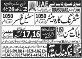 New Gondal Manpower Bureau invites applications for job positions advertised in daily Mashriq dated 16 August 2024 for following vacancies in Abu Dhabi, abu dhabi UAE.