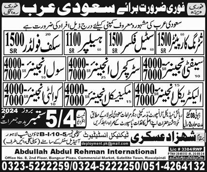 Abdullah Abdul Rehman International invites applications for job positions advertised in daily Express dated 27 August 2024 for following vacancies in Riyadh, riyadh Saudi Arabia.