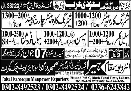 Faisal Farooque Manpower Exporter jobs advertisement dated about 31 May 2024 in daily Express Newspaper invites application for the vacant post of civil foreman, shuttering carpenter charge hand, steel fixer, shuttering carpenter and mason in Riyadh, riyadh Saudi Arabia. Middle, Intermediate and Matric etc. educational qualification will be preferred.