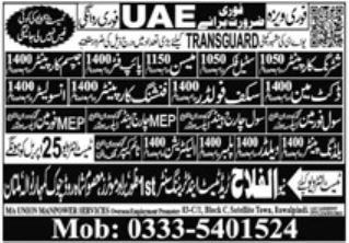 Vacant posts including mason, mep charge hand, scaffolder, finishing carpenter, welder, civil foreman, electrician, duct man, insulator, time keeper, gypsum carpenter, civil charge hand, pipe fitter, plumber, building painter, mep foreman, shuttering carpenter and steel fixer are announced in New Al Falah Trade Test & Training Center Abu Dhabi, abu dhabi UAE as per 17 April 2024 advertisement in daily Khabrain Newspaper. Educational qualifications required Matric, Intermediate and Middle etc.