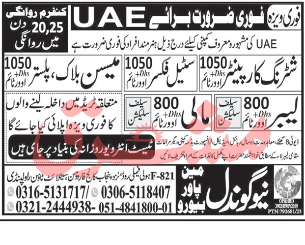 Vacant posts including shuttering carpenter, steel fixer, mali, block mason, plaster mason and labor are announced in New Gondal Manpower Bureau Abu Dhabi, abu dhabi UAE as per 4 October 2023 advertisement in daily Mashriq Newspaper. Middle etc. educational qualification will be preferred.