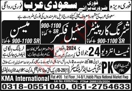 KMA International Overseas Employment invites applications for job positions advertised in daily Express dated 14 July 2024 for following vacancies in Riyadh, riyadh Saudi Arabia.