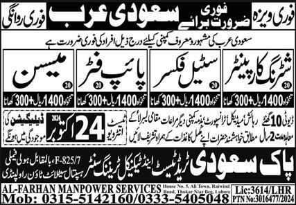 Al Farhan Manpower Services invites applications for job positions advertised in daily Express dated 23 October 2024 for following vacancies in Riyadh, riyadh Saudi Arabia.
