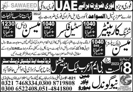 New Gondal Manpower Bureau is looking for candidates for following posts as per job advertisement published in daily Express Newspaper of August 7, 2023 for location Abu Dhabi, abu dhabi UAE: