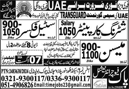 Pak Future International Abu Dhabi, abu dhabi UAE invites applications from eligible candidates for the post of shuttering carpenter, mason and steel fixer as per advertisement of August 7, 2024 published in daily Express Newspaper. Candidates with Middle etc. educational background will be preferred.