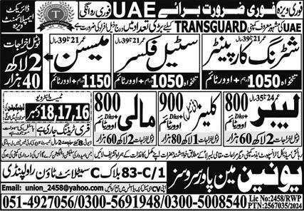 Union Manpower Services is looking for candidates for following posts as per job advertisement published in daily Express Newspaper of December 14, 2024 for location Abu Dhabi, abu dhabi UAE:
