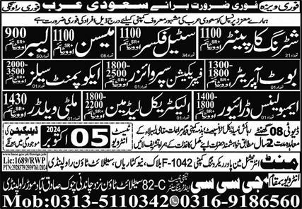 Vacant posts including boat maker, shuttering carpenter, fabrication supervisor, multi welder, electrical lead man, labor, steel fixer, ambulance driver, mason and equipment sales are announced in Mint International Manpower Recruitment Company Riyadh, riyadh Saudi Arabia as per 2 October 2024 advertisement in daily Express Newspaper. Preferred Education is Middle, Intermediate and Matric etc.