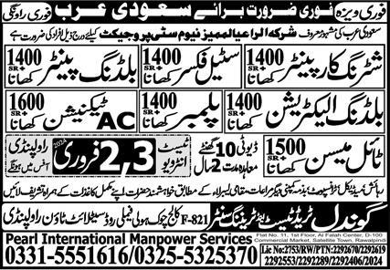 Pearl International Manpower Services Riyadh, riyadh Saudi Arabia invites applications from eligible candidates for the post of building electrician, plumber, steel fixer, ac technician, shuttering carpenter, building painter and tile mason as per advertisement of February 2, 2024 published in daily Express Newspaper. Candidates with Middle, Matric and Intermediate etc. educational background will be preferred.