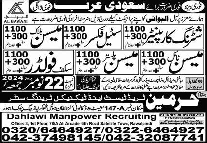 Dahlawi Manpower Recruiting Riyadh, riyadh Saudi Arabia invites applications from eligible candidates for the post of tile mason, block mason, plaster mason, scaffolder, shuttering carpenter and steel fixer as per advertisement of November 20, 2024 published in daily Express Newspaper. Educational qualifications required Middle etc.
