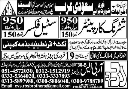 RBS Brothers jobs advertisement dated about 15 February 2022 in daily Express Newspaper invites application for the vacant post of steel fixer and shuttering carpenter in Riyadh Saudi Arabia. Persons with Middle and Matric etc. education can apply.