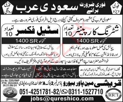 Qureshi Manpower Bureau invites applications for job positions advertised in daily Express dated 7 July 2024 for following vacancies in Riyadh, riyadh Saudi Arabia.
