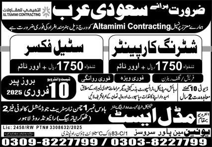 Union Manpower Services jobs advertisement dated about 4 February 2025 in daily Express Newspaper invites application for the vacant post of steel fixer and shuttering carpenter in Riyadh, riyadh Saudi Arabia. Persons with Middle etc. education can apply.