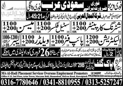 Al Hadi Placement Services jobs advertisement dated about 24 February 2024 in daily Express Newspaper invites application for the vacant post of welder, labor, steel fixer, electrician, pipe fitter, mason and shuttering carpenter in Riyadh, riyadh Saudi Arabia. Middle and Matric etc. educational qualification will be preferred.