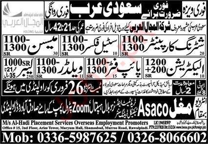Al Hadi Placement Services Riyadh, riyadh Saudi Arabia invites applications from eligible candidates for the post of steel fixer, welder, mason, shuttering carpenter, pipe fitter, electrician and labor as per advertisement of February 25, 2024 published in daily Express Newspaper. Persons with Middle etc. education can apply.