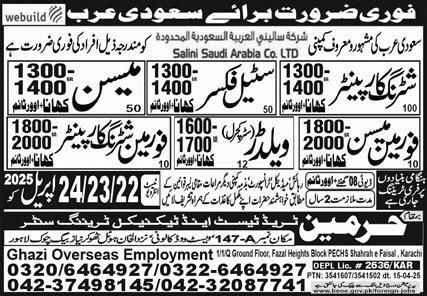 Vacant posts including foreman mason, foreman shuttering carpenter, steel fixer, shuttering carpenter, welder and mason are announced in Ghazi Overseas Employment Riyadh, riyadh Saudi Arabia as per 20 April 2025 advertisement in daily Express Newspaper. Educational qualifications required Intermediate, Middle and Matric etc.