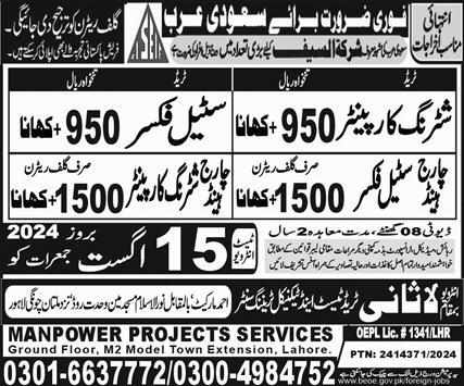 Lasani Trade Test & Training Center is looking for candidates for following posts as per job advertisement published in daily Express Newspaper of August 11, 2024 for location Madina, madina Saudi Arabia: