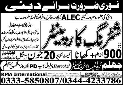 Jhelum Trade Test & Training Center latest Overseas Manufacturing jobs and others can be applied till June 20, 2023 or as per closing date in newspaper ad. Read complete ad online to know how to apply on latest Jhelum Trade Test & Training Center job opportunities. Carpentry and Construction skills may beneficial for these Jhelum Trade Test & Training Center jobs. Salary varies from 85000. Earn more by overtime. Free accommodation, food, medical and transport may be available.