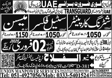 New Al Falah Trade Test & Training Center is looking for candidates for following posts as per job advertisement published in daily Express Newspaper of January 25, 2025 for location Sharjah, abu dhabi UAE: