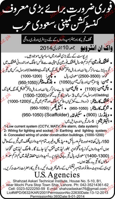 Shuttering Carpenter, Plumber, Tile Mason Wanted