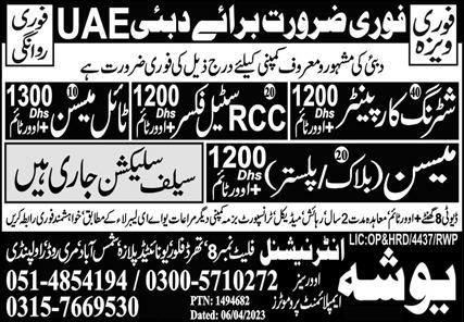Vacant posts including shuttering carpenter, tile mason, block mason, rcc steel fixer, mason and plaster mason are announced in Yosha International Overseas Employment Promoters Dubai, abu dhabi Dubai as per 2 August 2023 advertisement in daily Express Newspaper. Candidates with Matric and Intermediate etc. educational background will be preferred.