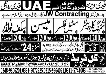 Gul Trade Test & Technical Center Sharjah, abu dhabi UAE invites applications from eligible candidates for the post of steel fixer, scaffolder, mason and shuttering carpenter as per advertisement of August 22, 2024 published in daily Express Newspaper. Persons with Intermediate, Middle and Matric etc. education can apply.