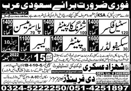 Shahzad Askari Technical Institute jobs advertisement dated about 14 April 2022 in daily Express Newspaper invites application for the vacant post of plaster mason, mason, painter, steel fixer, shuttering carpenter, scuff folder and labor in Dammam, dammam Saudi Arabia. Educational qualifications required Matric and Middle etc.