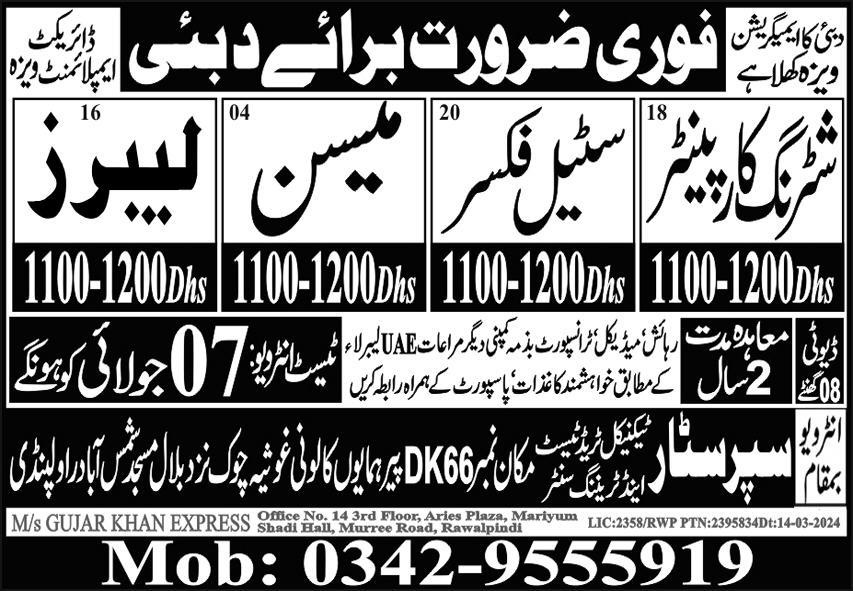 Super Star Technical Trade Test & Training Center Dubai, abu dhabi Dubai invites applications from eligible candidates for the post of shuttering carpenter, mason, steel fixer and labor as per advertisement of July 4, 2024 published in daily Express Newspaper. Matric and Middle etc. educational qualification will be preferred.