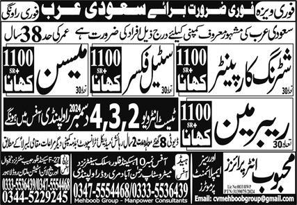 Mehboob Enterprises Overseas Employment Promoters jobs advertisement dated about 30 November 2024 in daily Express Newspaper invites application for the vacant post of steel fixer, repair man, mason and shuttering carpenter in Makkah, jeddah Saudi Arabia. Candidates with Middle and Matric etc. educational background will be preferred.