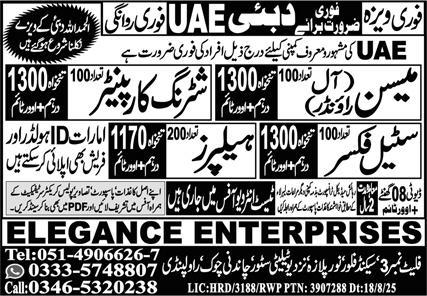 Vacant posts including steel fixer, helper, mason and shuttering carpenter are announced in Elegance Enterprises Dubai, abu dhabi Dubai as per 19 August 2025 advertisement in daily Express Newspaper. Persons with Intermediate and Matric etc. education can apply.