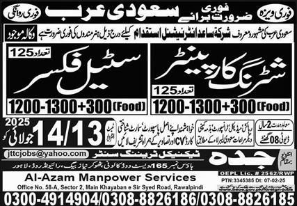 Jeddah Technical Trade Center jobs advertisement dated about 4 July 2025 in daily Express Newspaper invites application for the vacant post of shuttering carpenter and steel fixer in Riyadh, dammam Saudi Arabia. Intermediate and Matric etc. educational qualification will be preferred.