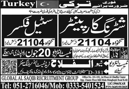 New Al Falah Trade Test & Training Center jobs advertisement dated about 14 June 2025 in daily Express Newspaper invites application for the vacant post of steel fixer and shuttering carpenter in Ankara, istanbul Turkey. Intermediate and Matric etc. educational qualification will be preferred.