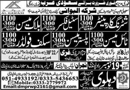Dahlawi Manpower Recruiting latest Overseas Construction jobs and others can be applied till November 19, 2024 or as per closing date in newspaper ad. Read complete ad online to know how to apply on latest Dahlawi Manpower Recruiting job opportunities. Salary varies from 103000. Earn extra money with overtime. Employer provides accommodation, medical and transport facility.