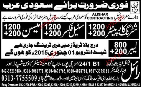 Mason, Shuttering Carpenters and Steel Fixers are required in Saudi Arabia.