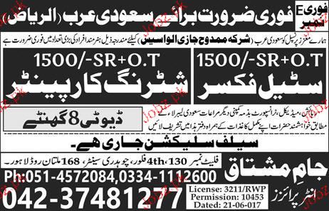 Shuttering Carpenters and Steel Fixers are required in Saudi Arabia. Food, Medical and Residence will be provided by the Company. Self Selection Undergoing.