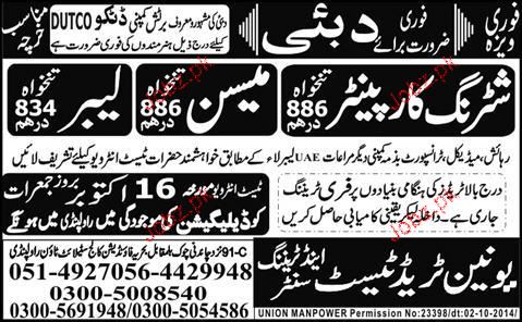Shuttering Carpenters, Mason and Labors Job Opportunity