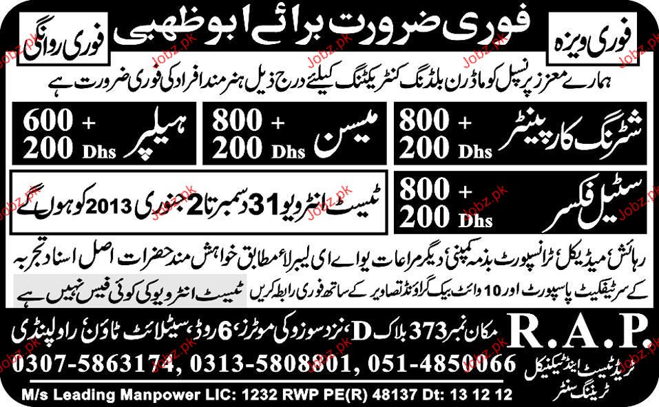 Shuttering Carpenters, Mason, Helpers Job Opportunity