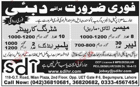 Shuttering Carpenters, Mason, Labors and Plumbers are required in Dubai