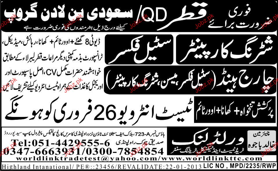 Shuttering Carpenters, Steel Fixer Job Opportunity