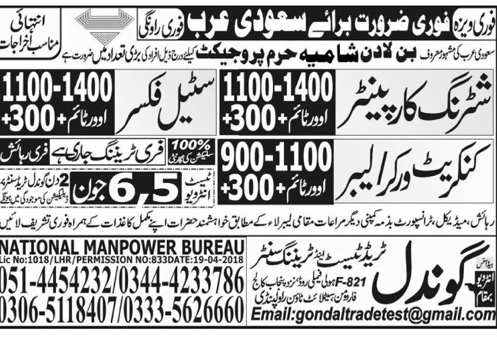 Latest Gondal Trade Test & Training Center Construction Posts Saudi Arabia 2025