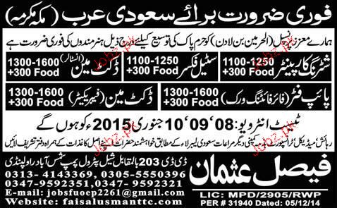 Shuttering Carpenters, Steel Fixers, Ductman, Pipe Fitters and Ductman are required in Saudi Arabia.